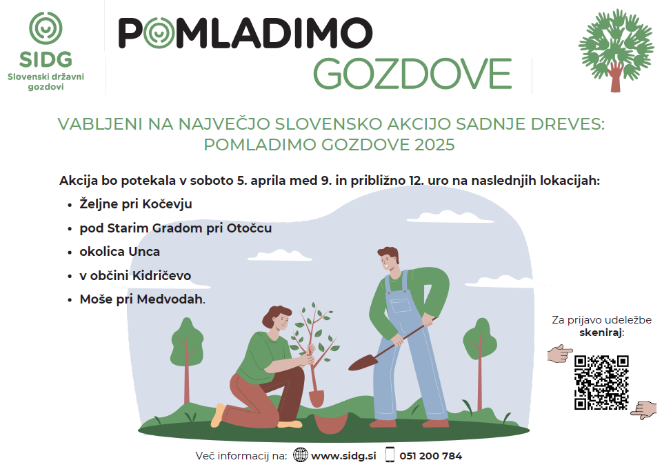 Glavni cilj akcije Pomladimo gozdove je ozaveščati javnost o pomenu ohranitve gozdov in narave. Do ponovne vzgoje kakovostnih gozdov, ki so zaradi podnebnih sprememb vedno bolj podvrženi naravnim ujmam, namreč lahko pridemo samo ob sodelovanju gozdarske stroke, lastnikov gozdov in širše družbene skupnosti. V okviru akcije Pomladimo gozdove bomo posadili okoli 7000 sadik. Sadili bomo sedem različnih drevesnih vrst, saj je za prihodnost gozdov ključna genetska pestrost. Raziskave so pokazale, da bo zaradi podnebnih sprememb, ujm in napadov škodljivcev lahko v prihodnosti preživel le gozd, ki bo imel genetsko pestro mladje. Na spletu se zaradi lažje organizacije do 26. marca 2025 zbirajo prijave udeležencev. Iz smeri Osnovne šole Otočec proti Starem gradu je na levi strani manjši kozolec, ob njem je parkirišče in zbirno mesto. Od kozolca do lokacije za sadnjo je 5 minut hoje. Sadnja sadik gozdnega drevja je nezahtevno opravilo, primerno za vse generacije. Udeleženci morajo s seboj prinesti orodje – rovnico, kramp ali motiko. Prostovoljci potrebujejo še zaščitne vrtnarske rokavice in primerno terensko obutev. Najlažje je, če sadimo v paru, tako da imata lahko dva prostovoljca skupaj eno orodje. Na deloviščih bodo udeležence pričakali gozdarji SiDG in Zavoda za gozdove Slovenije, ki bodo izvedli demonstracijo pravilne sadnje in nudili strokovno pomoč.